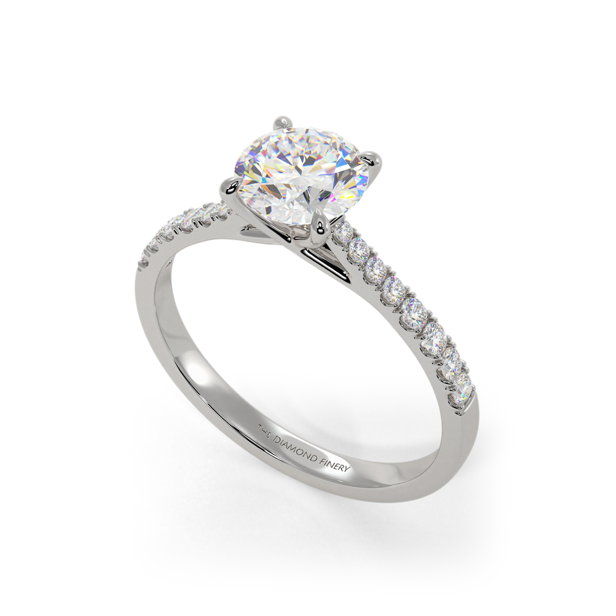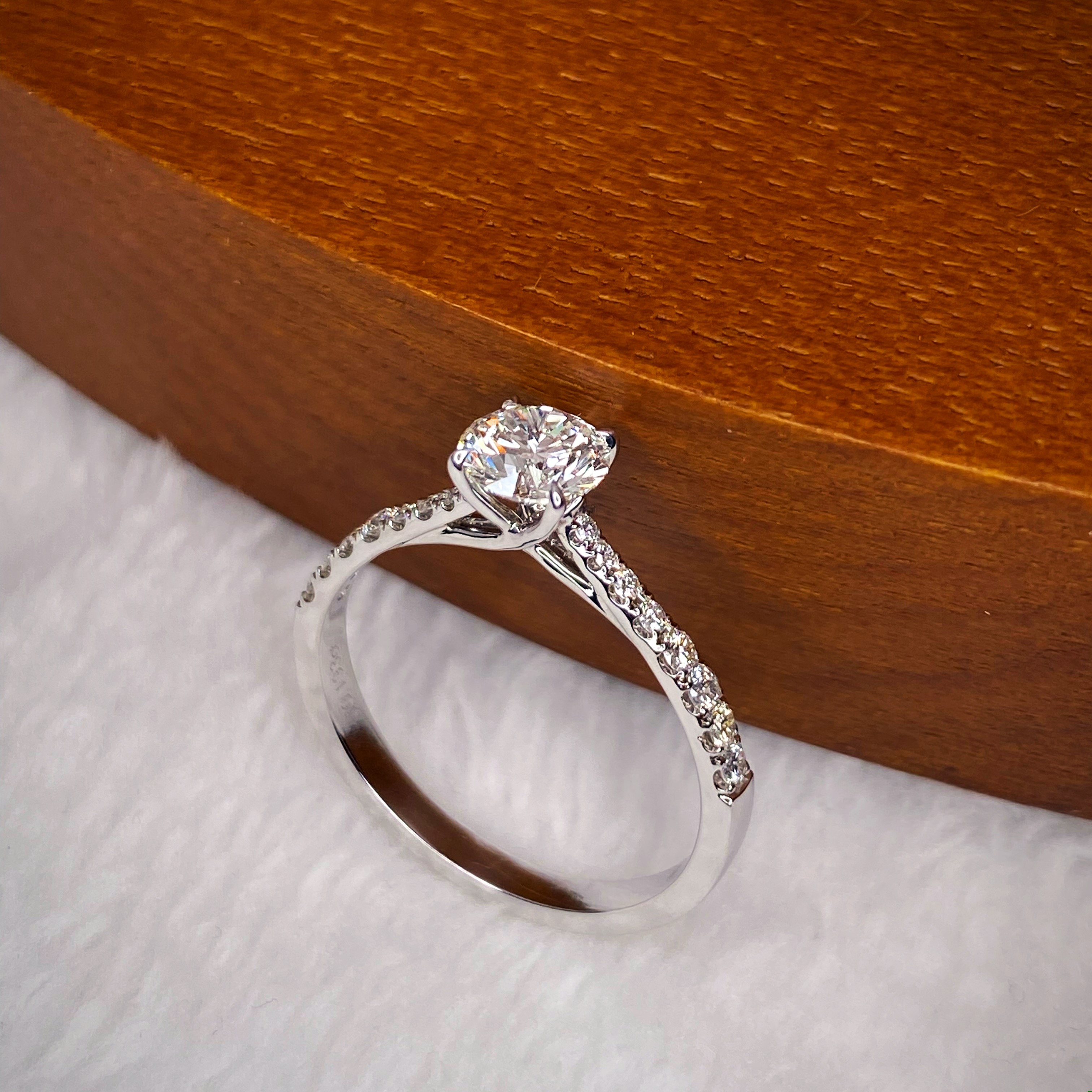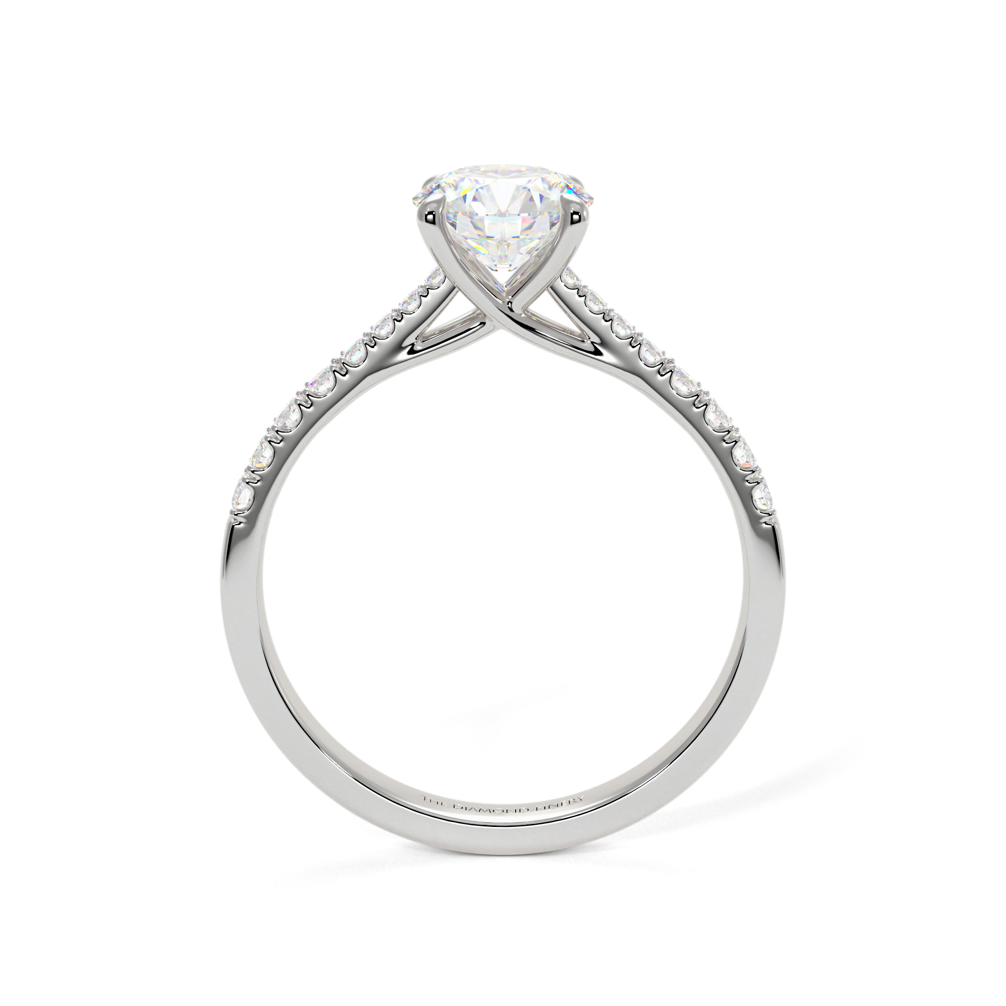 Precision and symmetry were crucial elements in crafting this ring, which displays a brilliant round diamond elevated by a slightly tapered band and smaller diamonds in a pavé band.
