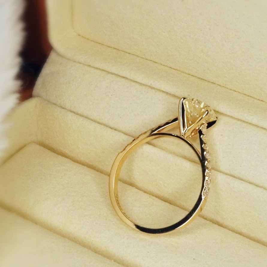 This design consists of a brilliant round diamond flanked by smaller diamonds of the same size set in a pavé style.