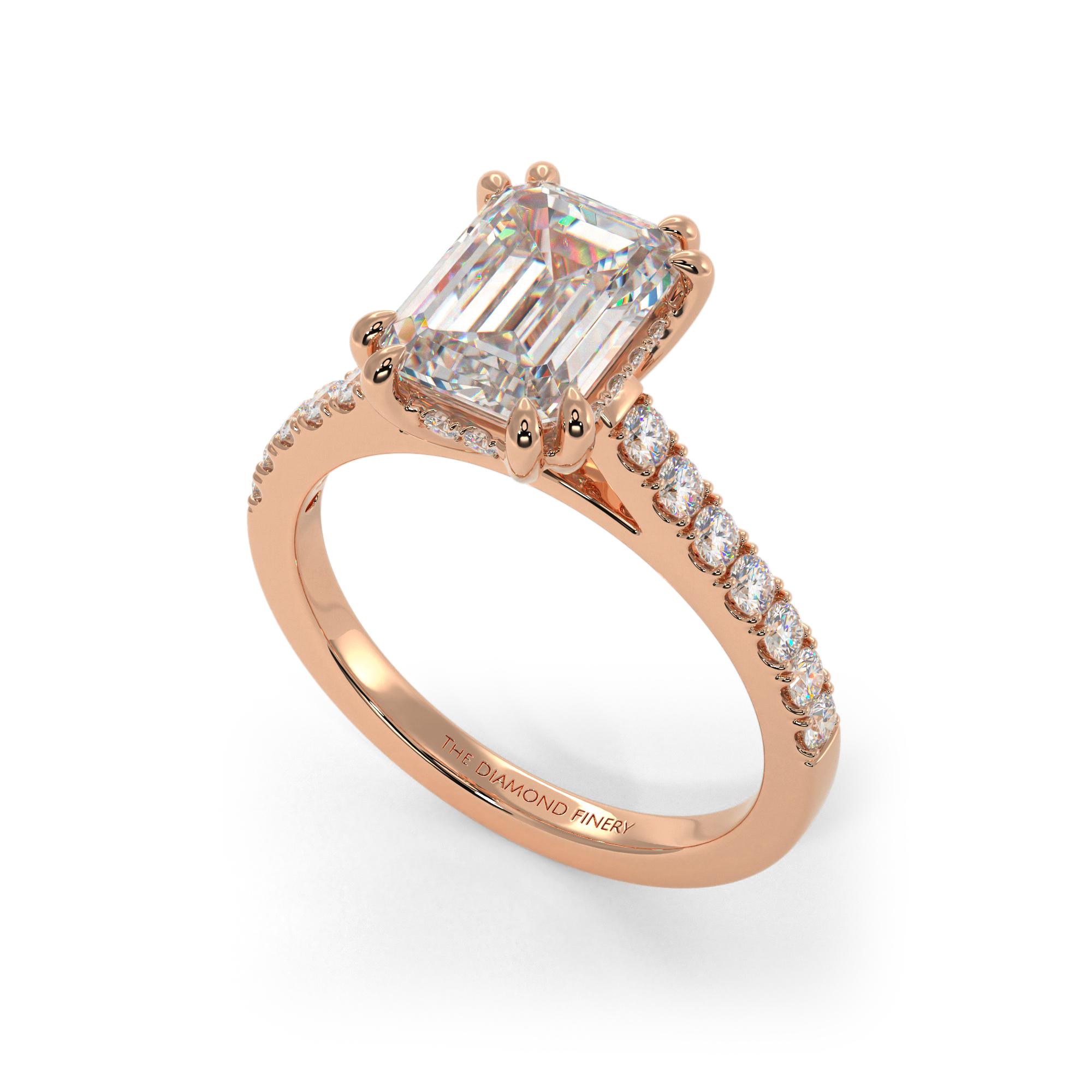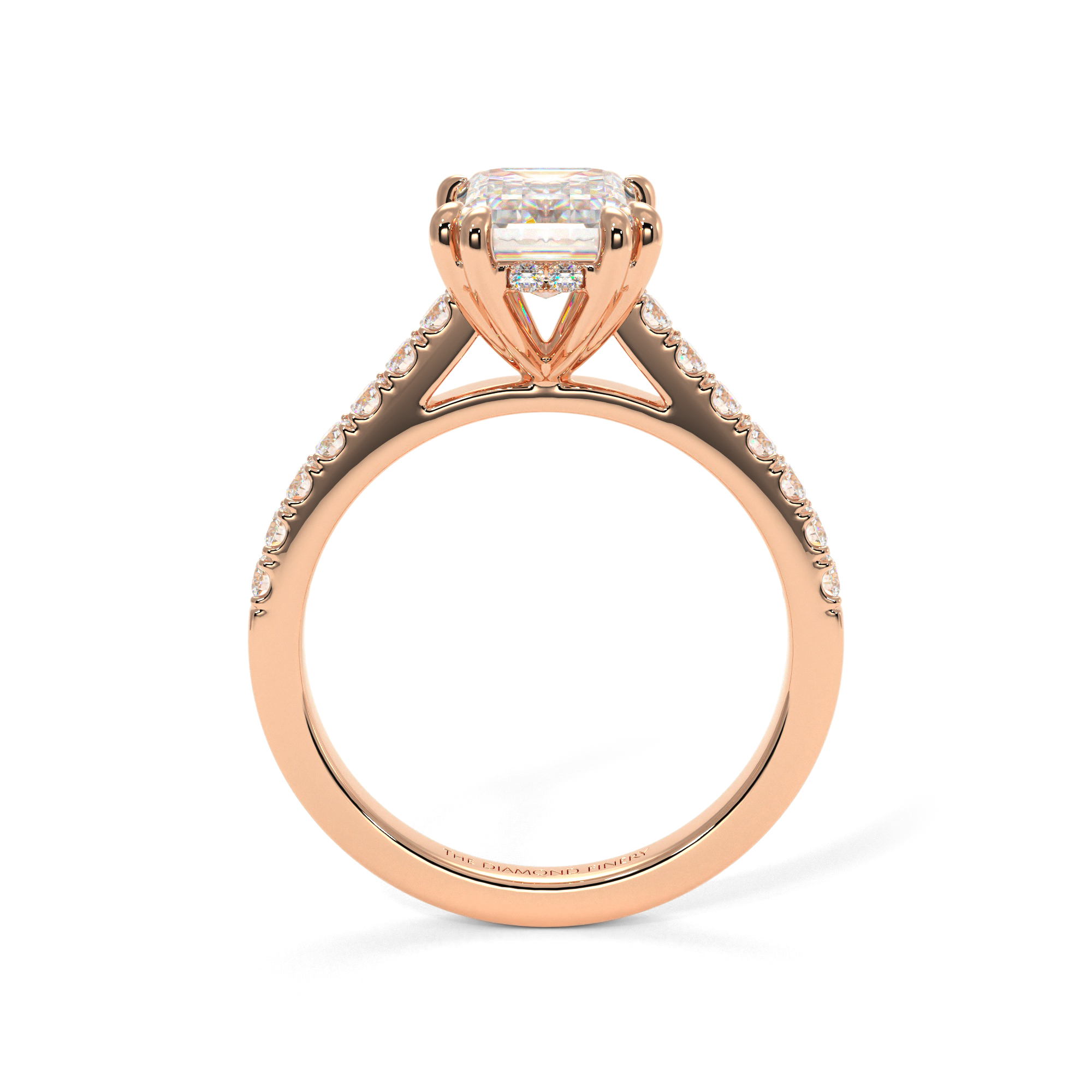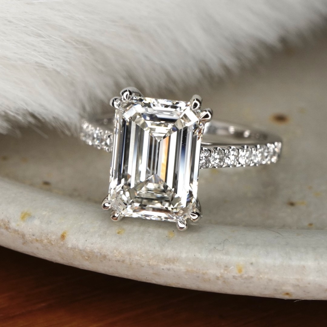 There are many factors that make this stunning ring a conversation starter: the emerald center stone, the double claw prongs on each corner, and the 12 smaller accent diamonds in the shank, among them. A pleasant surprise is the extra stones flanking the ring’s gallery. This may come with a center stone of your choice.