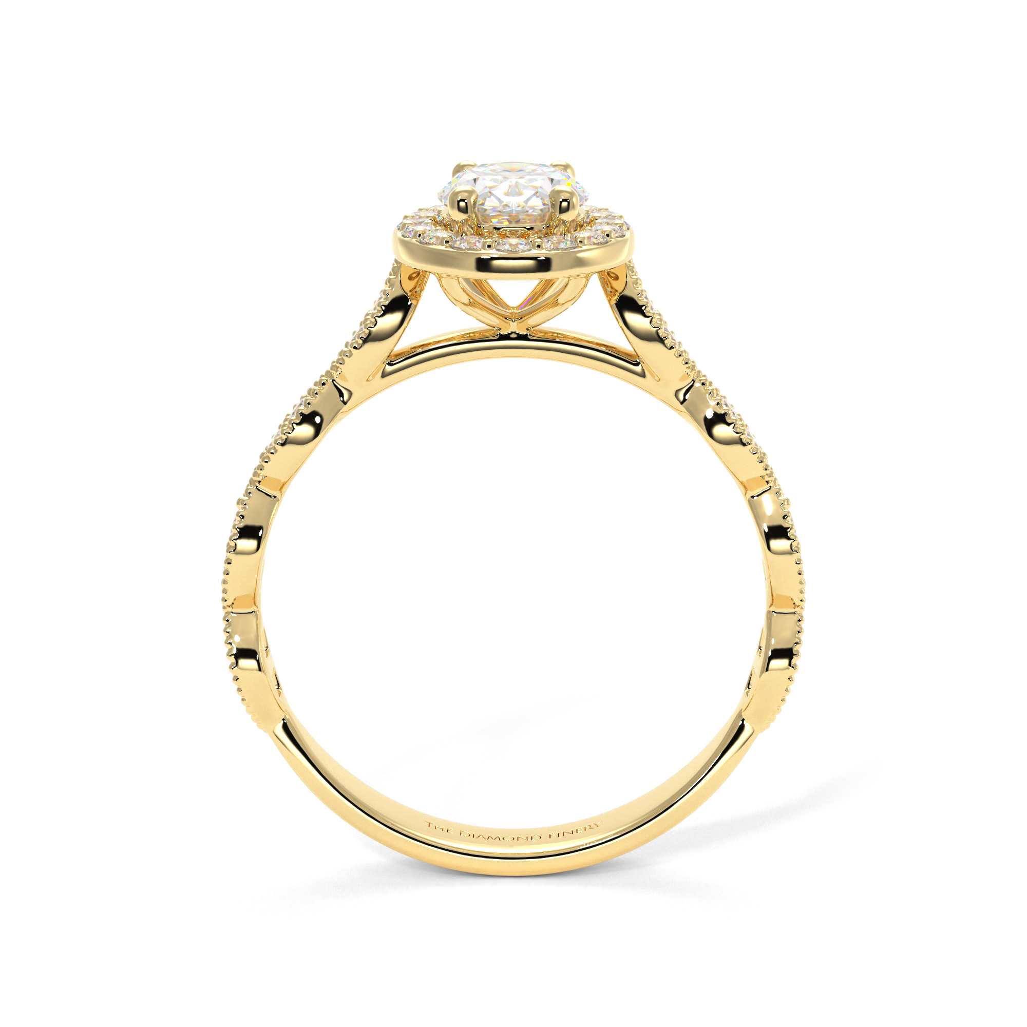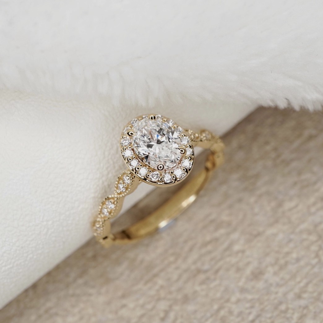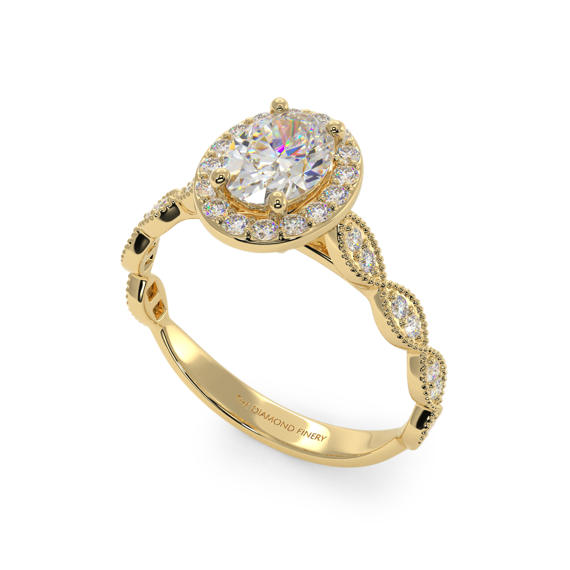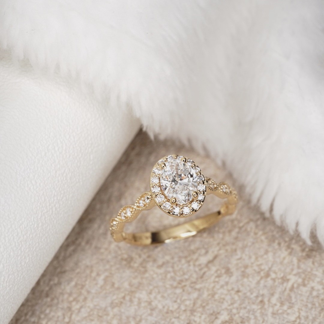 "The eye-catching Lucie is designed with an oval diamond framed by 16 smaller stones in a halo setting and further accentuated by the criss-cross band featuring more diamonds and a delicate milgrain edging.