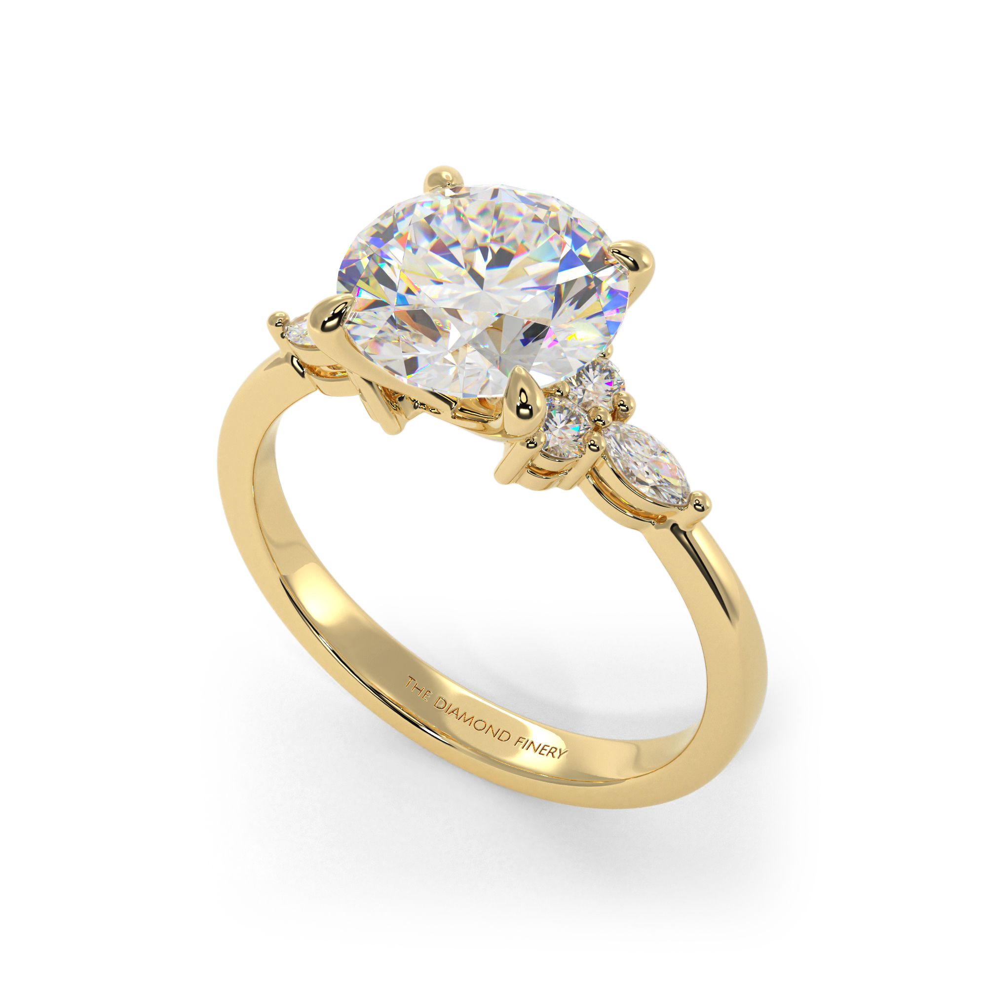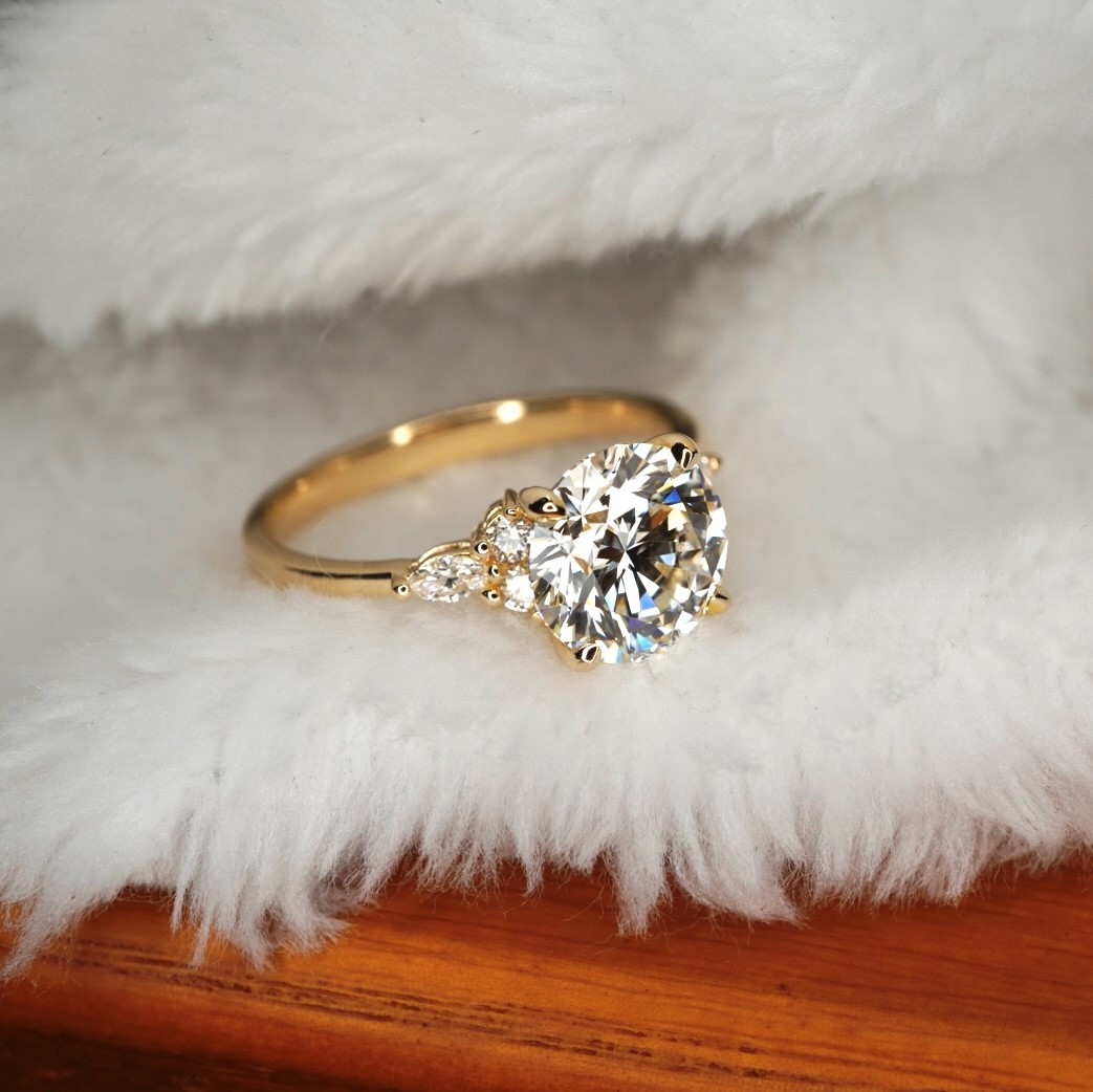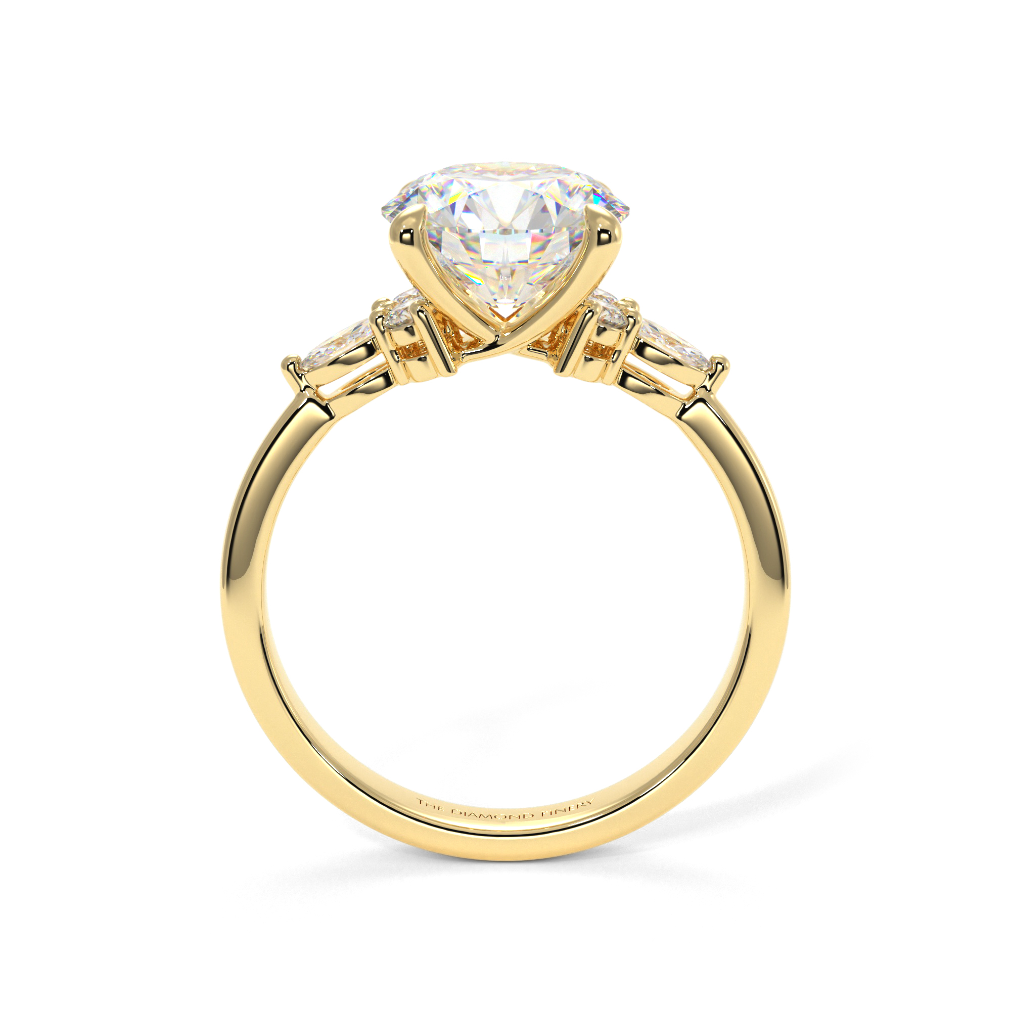 Framing the brilliant round diamond are four claw prongs alongside two side stones and a stunning marquise-cut diamond on each side of the center stone.