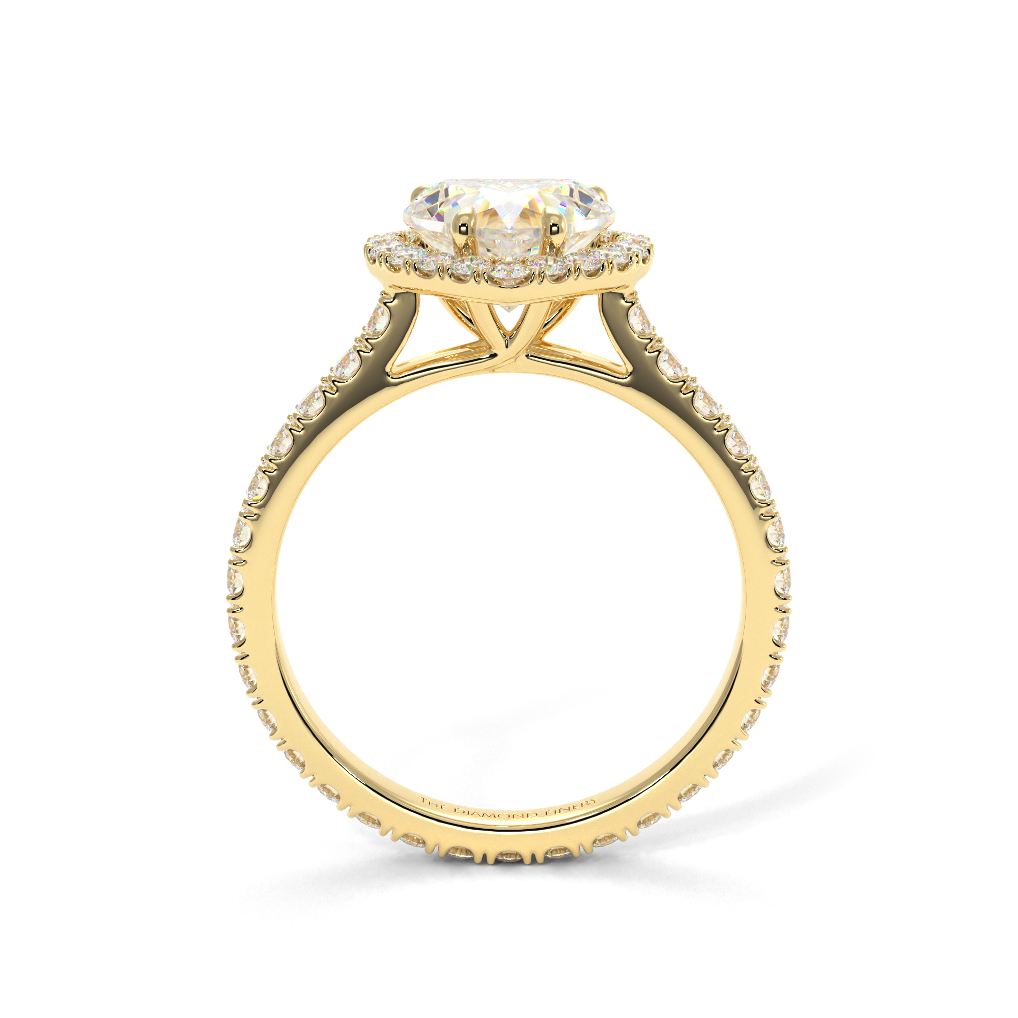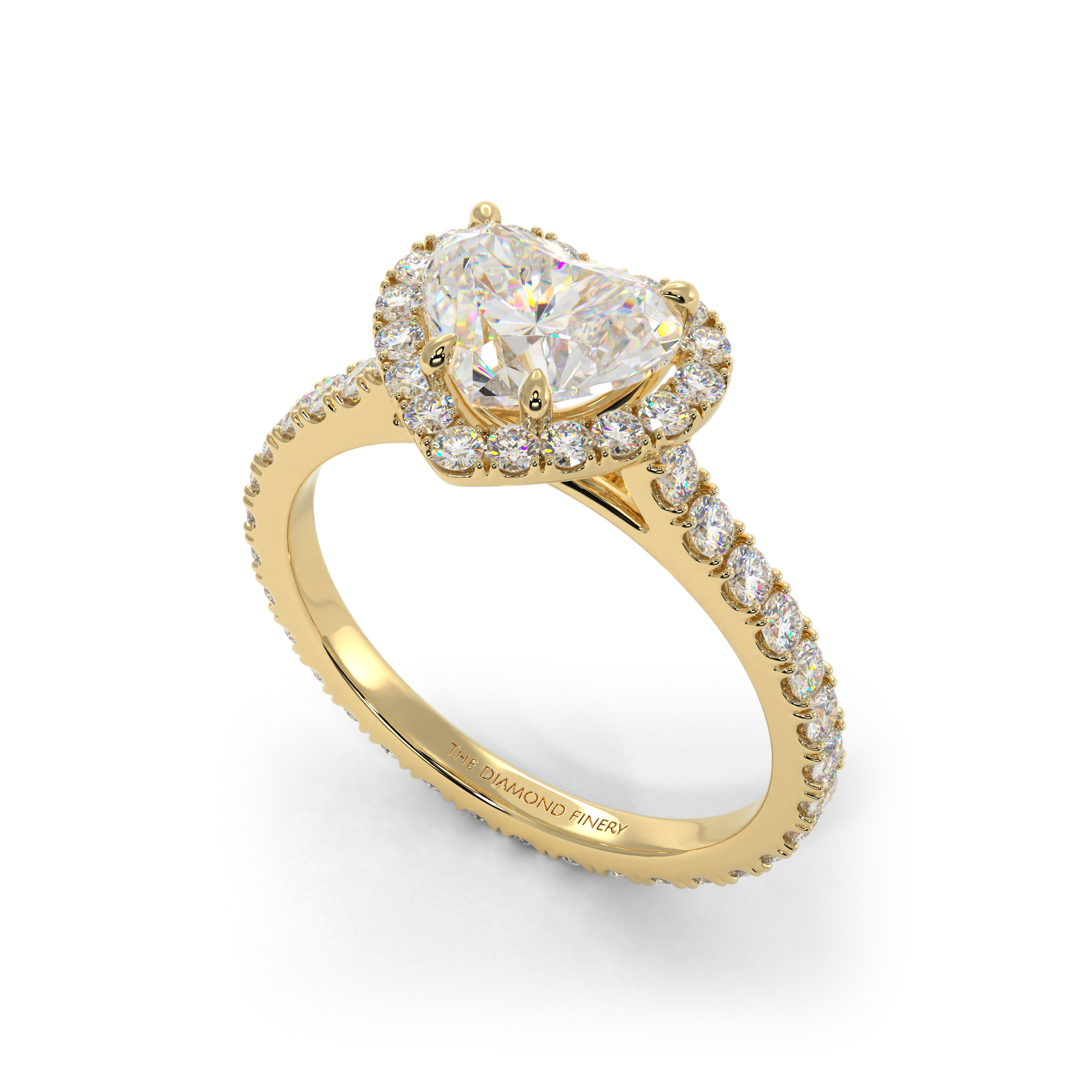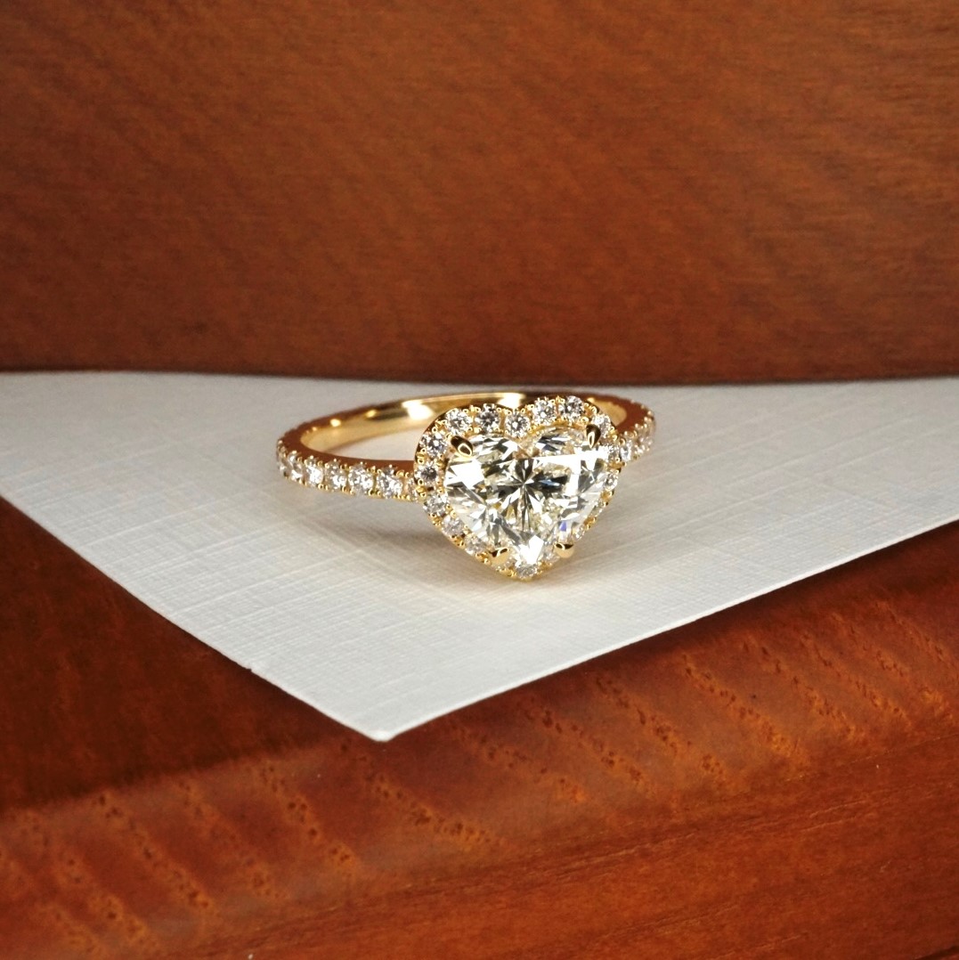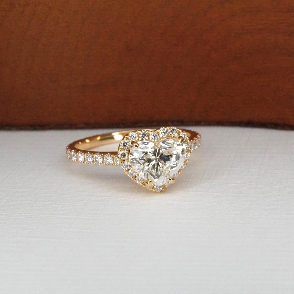 A distinct heart-cut diamond sits enveloped in a halo setting and partnered with a stunning infinity band.