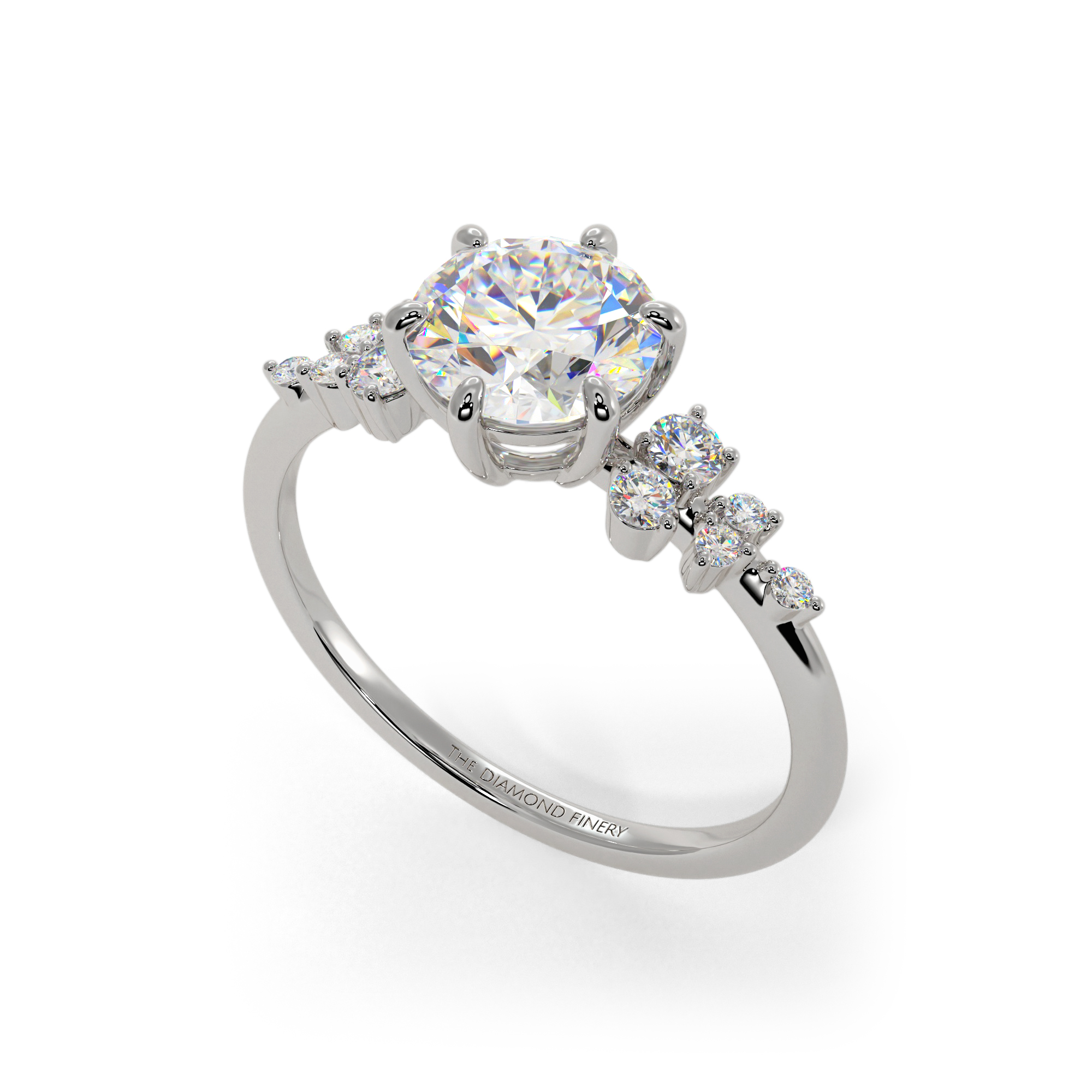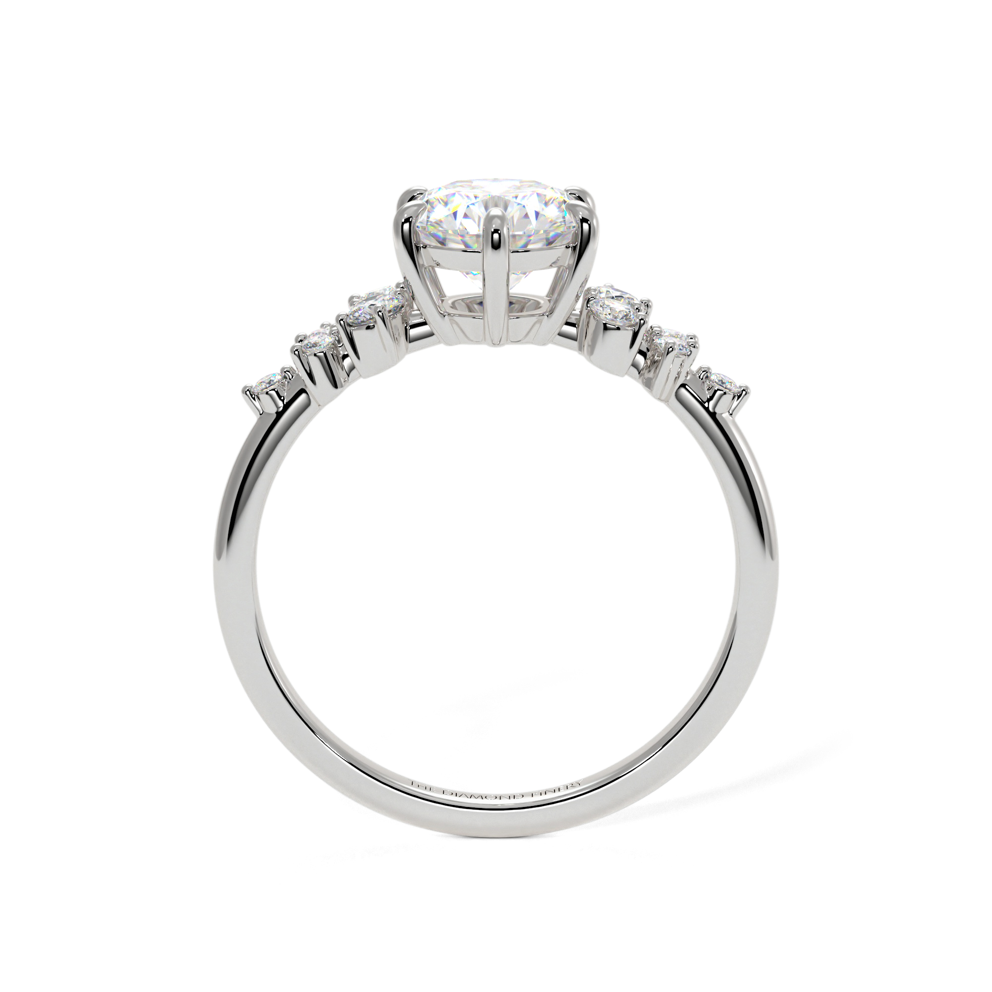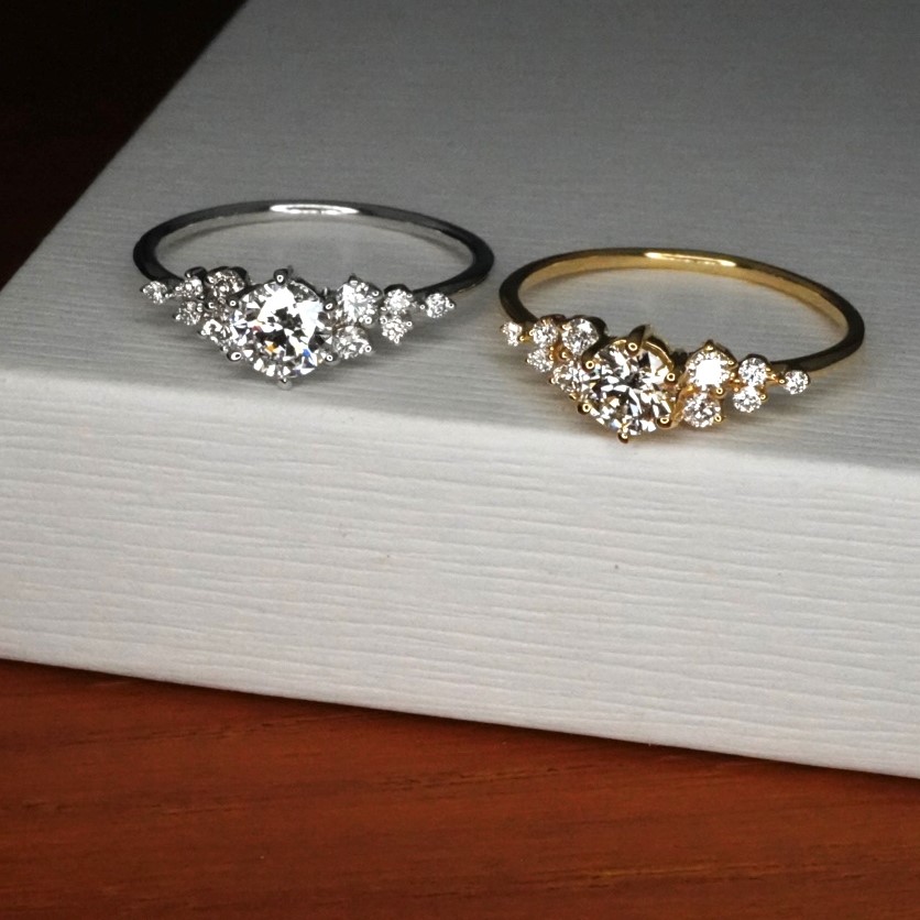 This diamond ring is designed with a brilliant round stone at the center, held on by six claw prongs and surrounded by multiple side stones scattered around for a heavier and more lustrous look.