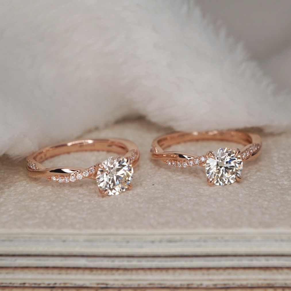 "A gorgeous round diamond is situated by claw prongs on a band with a twist of diamonds.