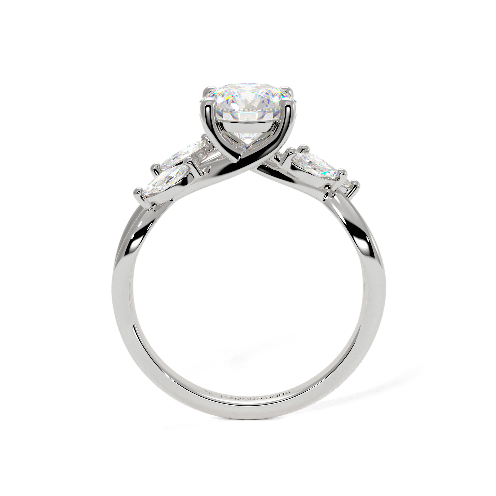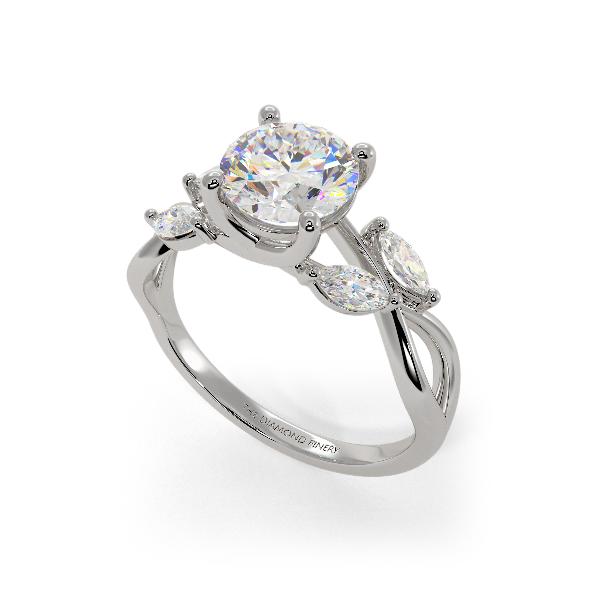 This isn't the twist setting you typically see—the round diamond at the center is held in place by claw prongs and a new take on the twist band, which is adorned by four marquise-cut diamonds.