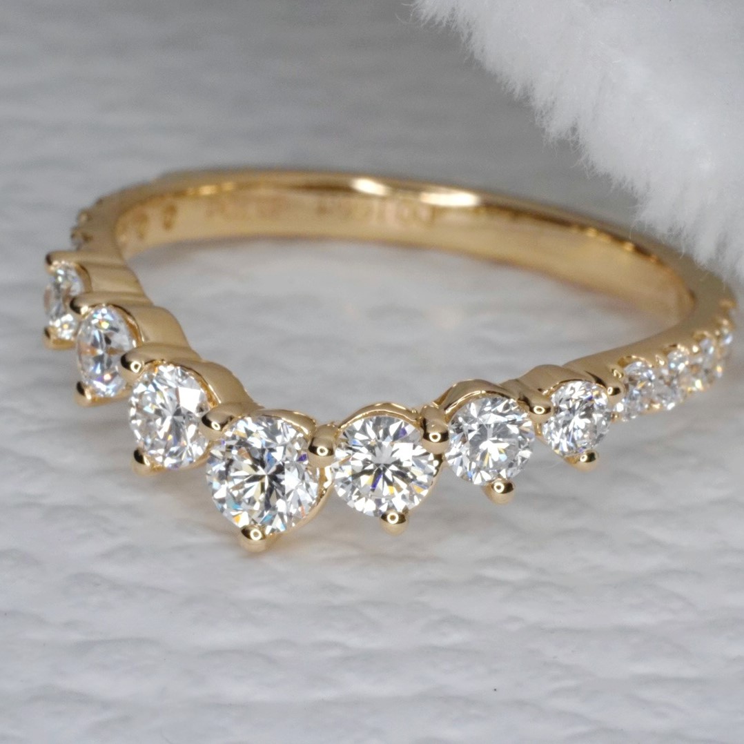The glimmer of several stones and a fun V-shape characterize this statement ring. It comes with a pavé of diamonds and may be set in yellow gold, white gold, or rose gold.