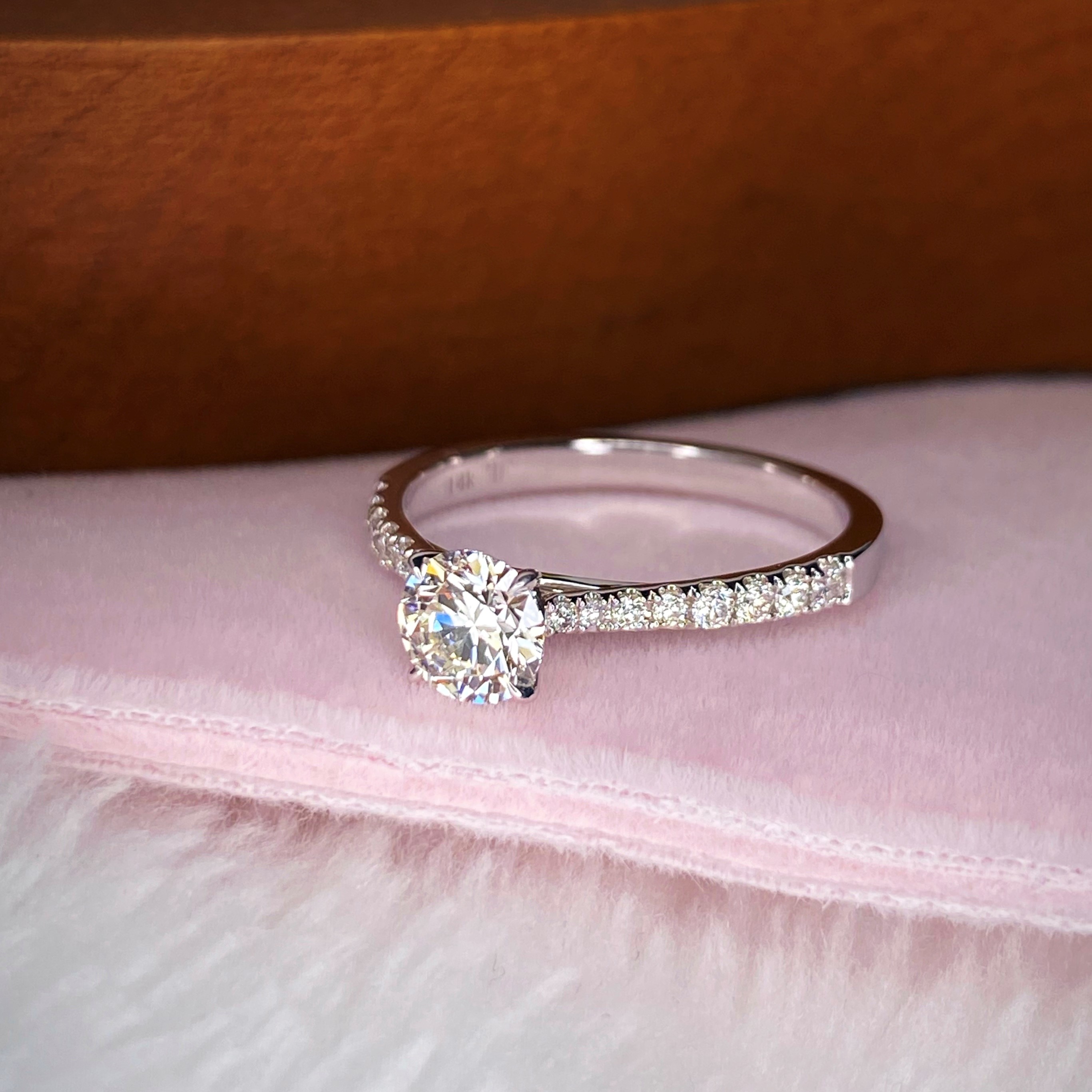 Precision and symmetry were crucial elements in crafting this ring, which displays a brilliant round diamond elevated by a slightly tapered band and smaller diamonds in a pavé band.