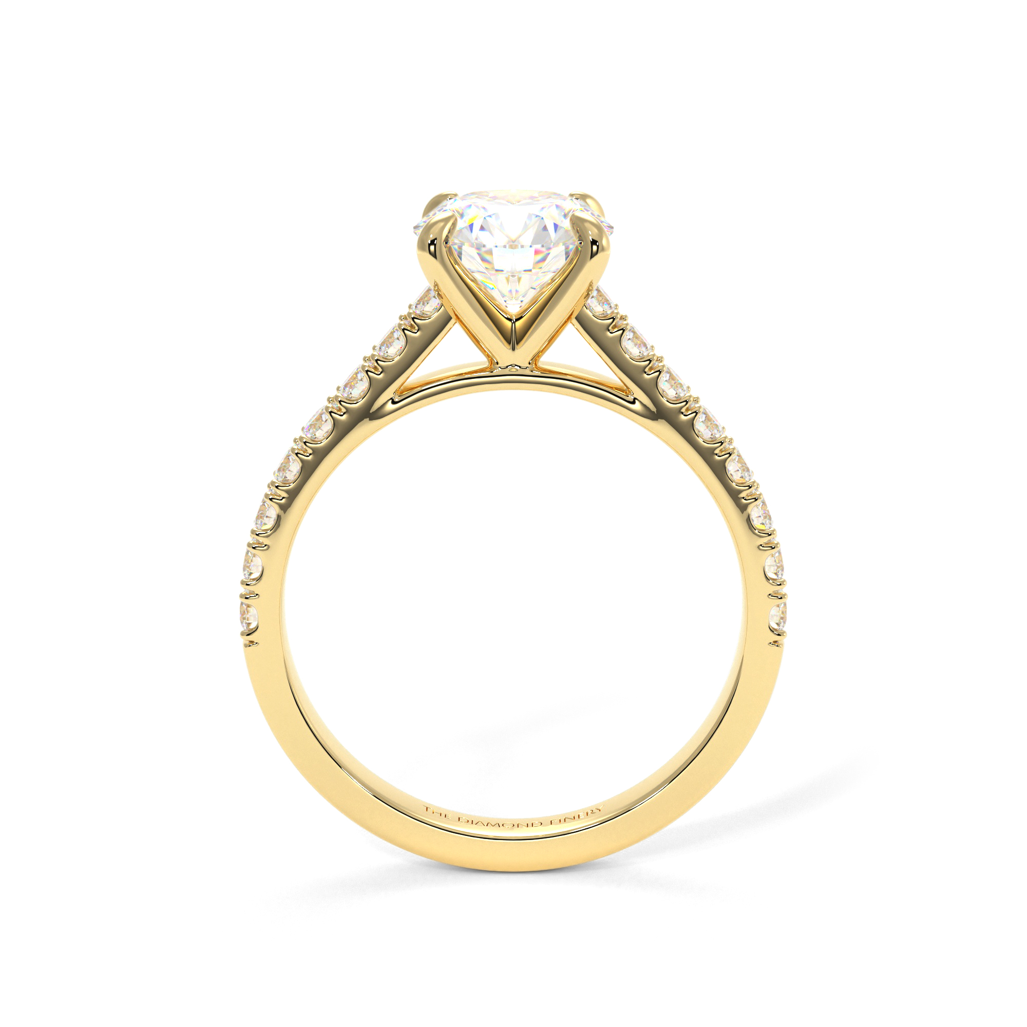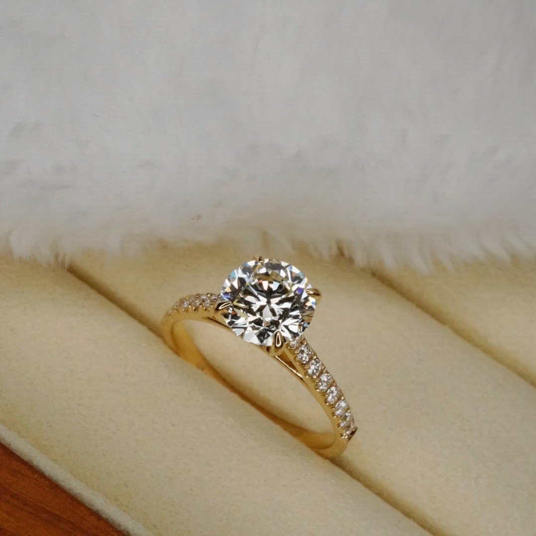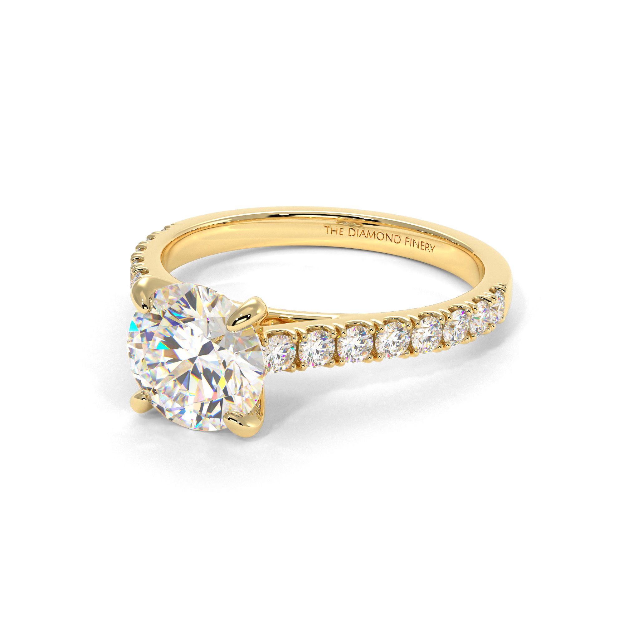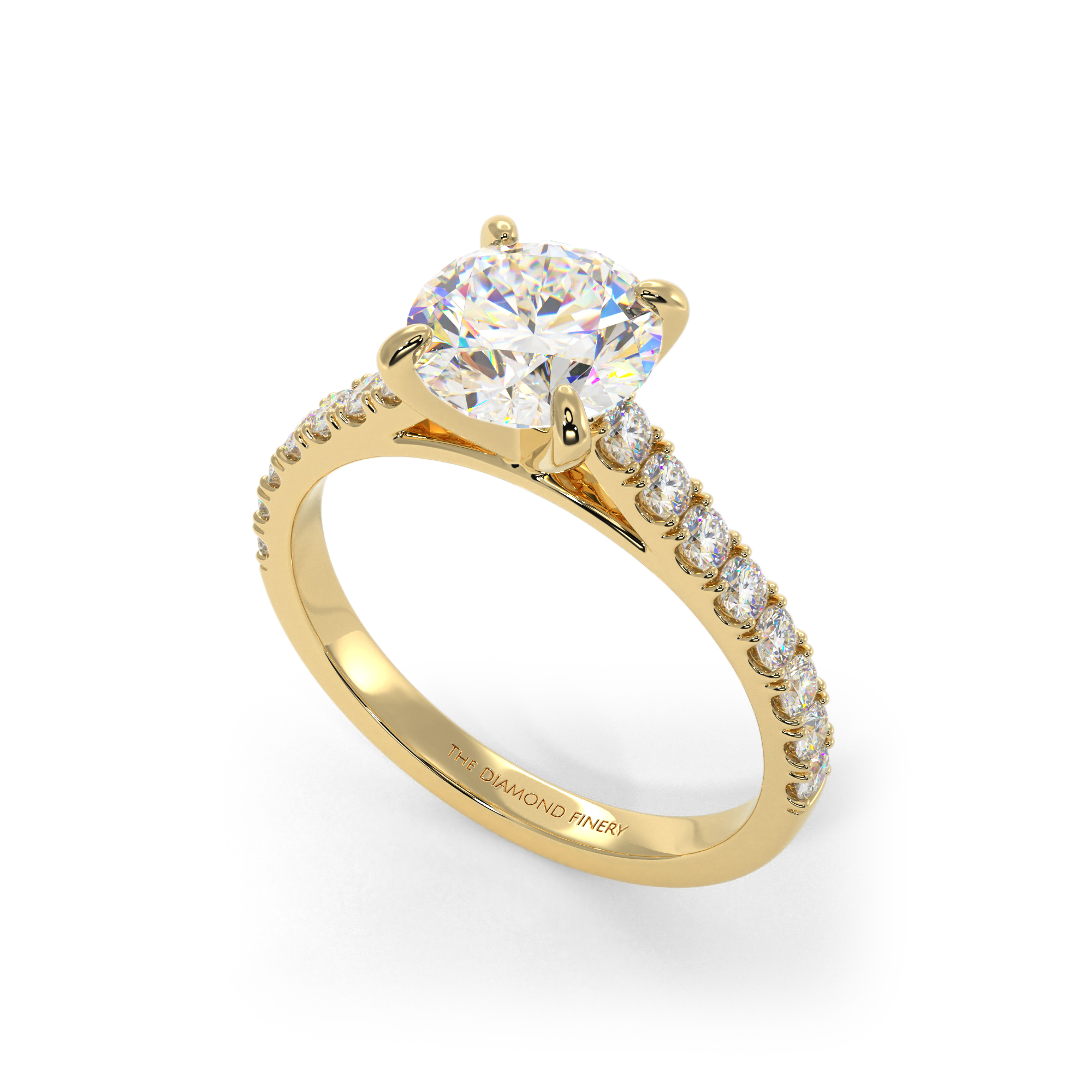 This design consists of a brilliant round diamond flanked by smaller diamonds of the same size set in a pavé style.