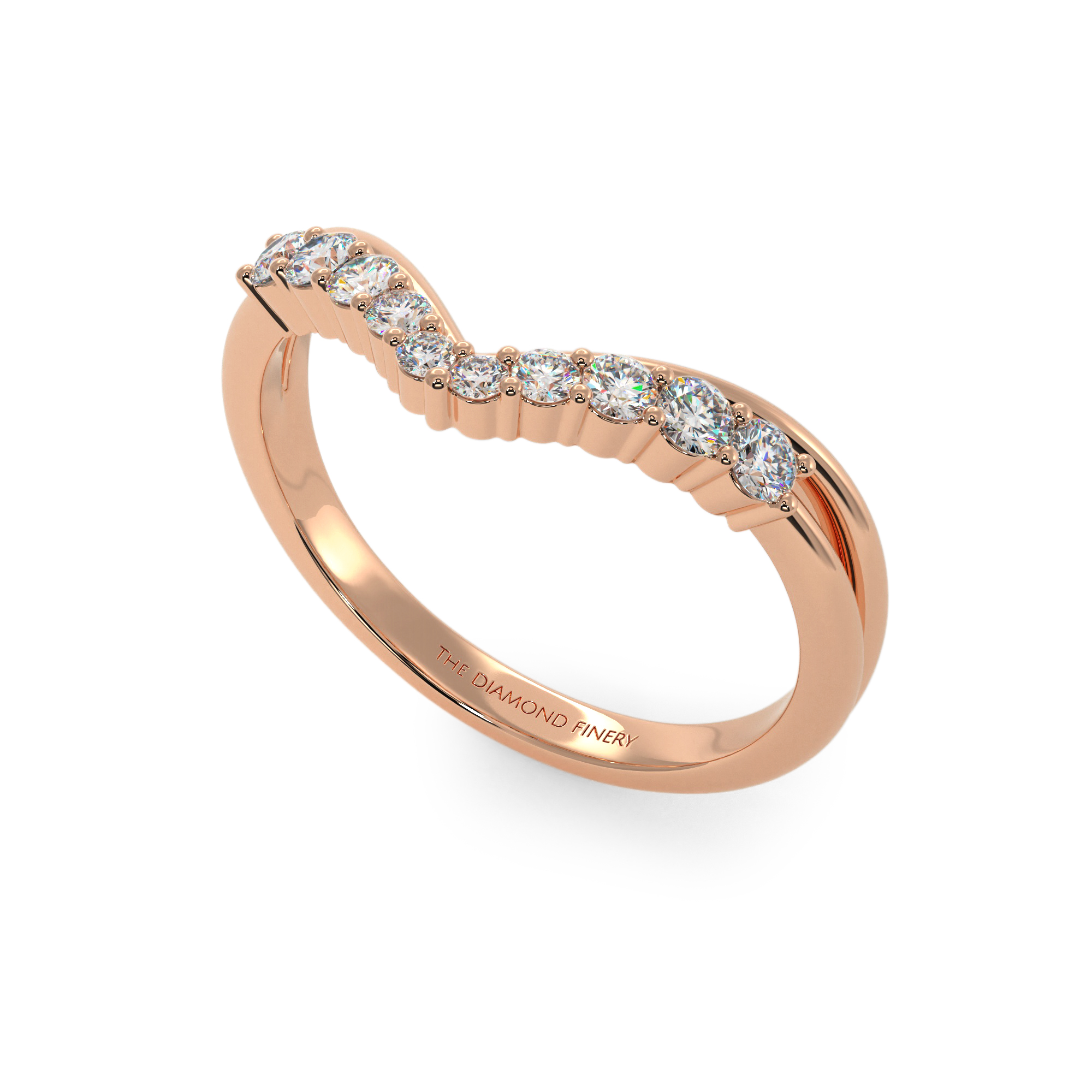 Accentuated by its V shape, this ring puts a pavé of prong set diamonds above a tapered layer of metal.